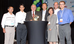 Current student Darsen Lu, UC/Berkeley; former student Clement Wann, TSMC; Larry Sumney, SRC; Chenming Hu, UC/Berkeley; Mrs. Hu; former students Dennis Sylvester, University of Michigan, and Michael Orshansky, UT/Austin