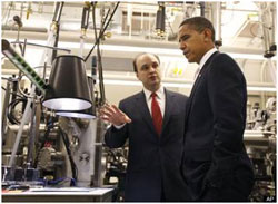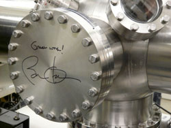 President Barack Obama, during a recent visit to the MIT campus, toured Professor Vladimir Bulovic's Organic and Nanostructured Electronics lab. During a tour of MIT research labs, President Barack Obama left his signature for MIT students on a piece of equipment in the Organic and Nanostructured Electronics Laboratory.